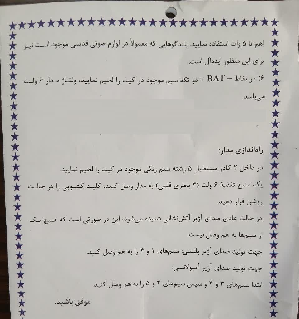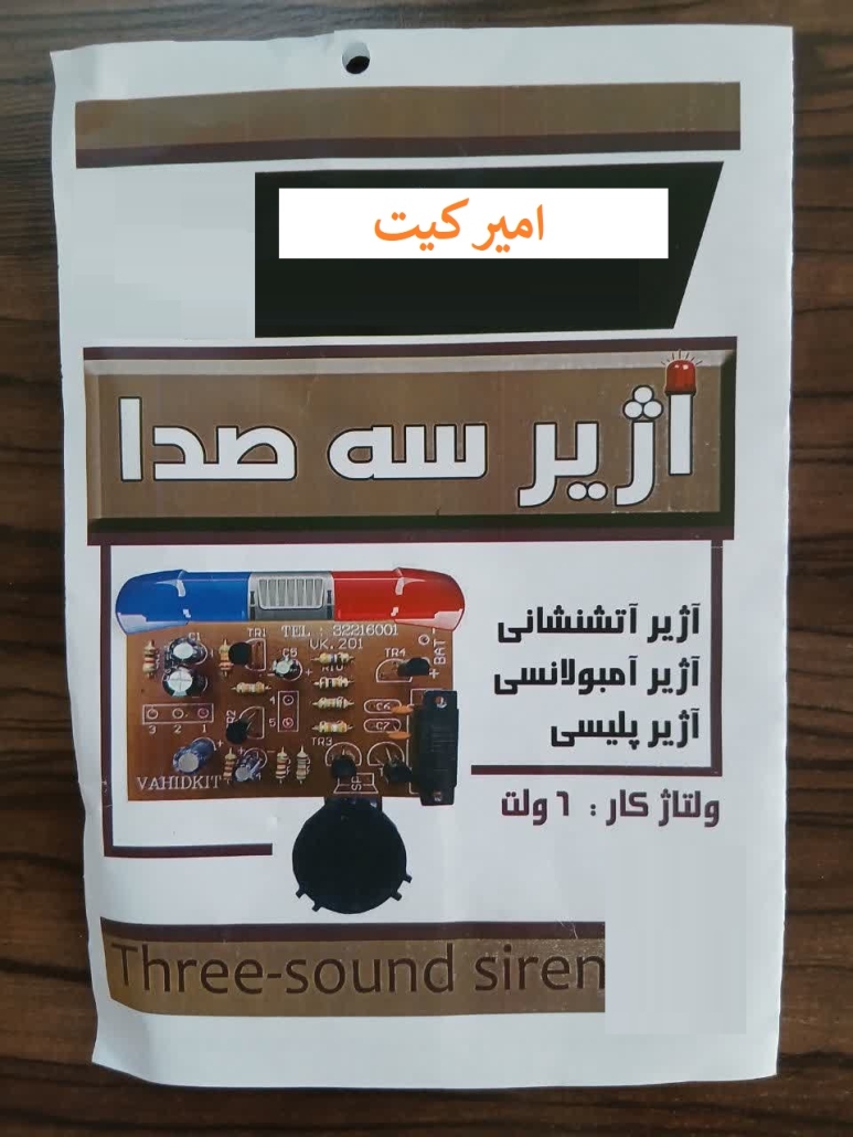 کیت آژیر سه صدا آژیر آمبولانس، آژیر پلیس و آژیر آتش نشانی از دسته گجتهای نیمه حرفهای است وهمانگونه که از نامش پیداست یک تقویت کننده صدا است که شامل سه نوع متفاوت آژیر خطر می باشد. این مدار خیلی ساده و یا خیلی پیچیده نیست ولی با کمی دقت و حوصله براحتی قادر به ساخت و راه اندازی آن خواهید شد.عملکرد خوب این مدا، ولتاژ تغذیه، قابلیت تولید صدای آژیرپلیس، آمبولانس، آتش نشانی؛ و خروجی خوب آن باعث شده تا بتوان از آن در اتومبیل به عنوان دزدگیر ساده استفاده کرد. البته تکنولوژی به کار رفته در این مدار مربوط به سال ها پیش است و انتظار در حد خودش می باشد.