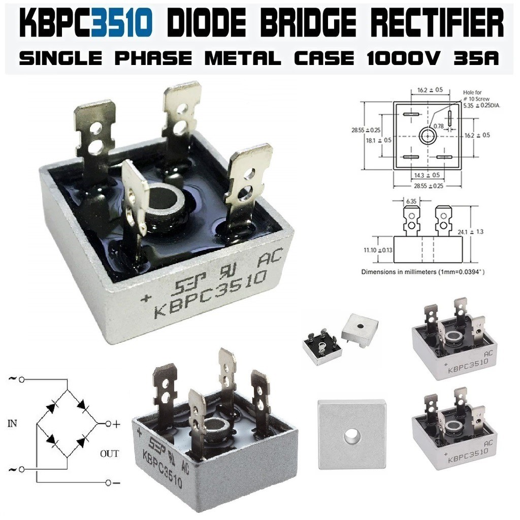 پل دیود تک فاز جریان IF : مقدار ۳۵ آمپر ولتاژ پیک معکوس: ۱۰۰۰ ولت ولتاژ Vf : مقدار ۱.۱ ولت حداکثر جریان لحظه ای Surge : مقدار ۴۰۰ آمپر محدوده کارکرد دمایی: ۵۵- تا ۱۵۰+ درجه سانتیگراد